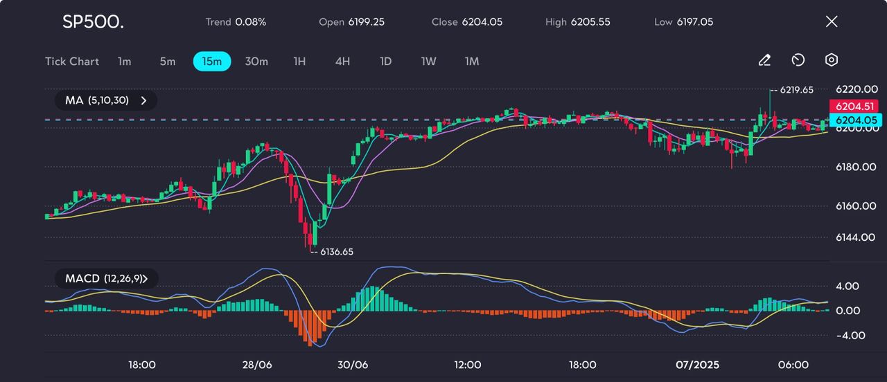 On the 15-minute chart, the SP500 price remains well-supported by the 30-period moving average. After a steep dip to 6,136.65 last Friday, the index rebounded strongly. The MACD histogram has turned positive again, and the signal lines are tilting upward, suggesting a possible continuation of the bullish trend—though momentum is modest.