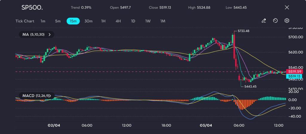 The S&P 500 experienced a sharp reversal on Wednesday following U.S. President Donald Trump’s surprise announcement of sweeping tariffs against major global trade partners, triggering broad-based selling in equities. The benchmark index plunged from an intraday high of 5,733.48 to a low of 5,443.45, before modestly recovering to close at 5,519.13.
