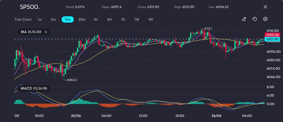 Over the past couple of days, the S&P 500 has rebounded from a dip near 5,920, retracing to the 6,010–6,012 resistance zone. The 5-, 10-, and 30-period MAs remain tightly bunched, suggesting consolidation after a sharp move.