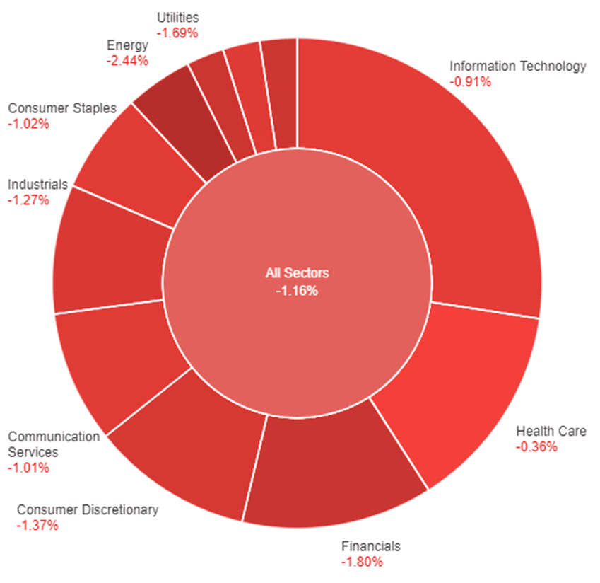 On Tuesday, the stock market witnessed widespread declines across all sectors, with a notable decrease of 1.16%. Among the sectors, Energy suffered the most significant drop, plummeting by 2.44%, while Financials and Utilities also experienced substantial declines of 1.80% and 1.69%, respectively. Consumer Discretionary and Materials sectors faced losses of 1.37% and 1.65%, highlighting a challenging day for these segments. Industrials and Real Estate both slid by 1.27% and 1.07%, respectively. Communication Services and Consumer Staples followed suit with decreases of 1.01% and 1.02%. Information Technology encountered a decline of 0.91%, while Health Care demonstrated relatively milder losses of 0.36%.