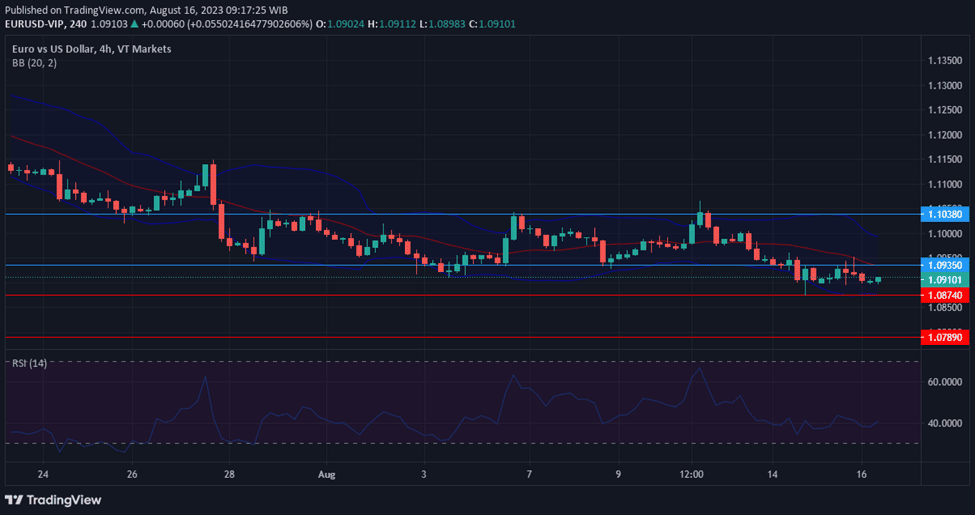 Based on technical analysis, the EUR/USD moves flat on Tuesday, creating a flat move in the bands of the Bollinger Bands. Currently, the price is moving between the middle and the lower of the Bollinger Bands. The Relative Strength Index (RSI) presently stands at 40, signifying that the EUR/USD is currently in a consolidation phase with a slight bearish undertone.