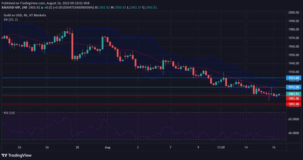 Based on technical analysis, the XAU/USD witnessed a slight decrease on Tuesday, the price managed to reach the lower band of the Bollinger Bands during this movement. At present, the price is retracing higher. The Relative Strength Index (RSI) is currently at 37, indicating that the XAU/USD pair is exhibiting a somewhat bearish sentiment.