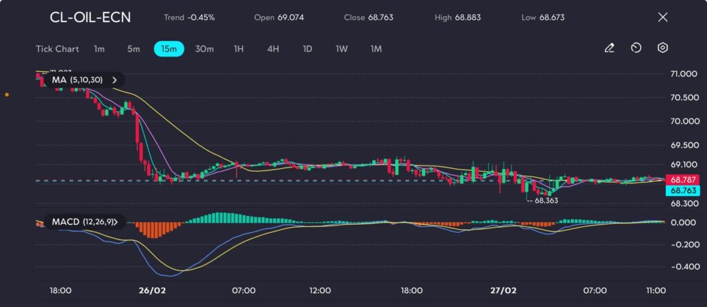 Crude oil has faced continued downward pressure, with prices dropping 0.45% in the latest session. The price opened at $69.074 and closed at $68.763, with a high of $68.883 and a low of $68.673. The MACD remains negative, confirming ongoing bearish momentum, while the short-term moving averages (5, 10, 30) are acting as resistance, keeping prices suppressed. A recent low of $68.36 was tested, suggesting that support is forming at this level, though the broader trend remains weak.