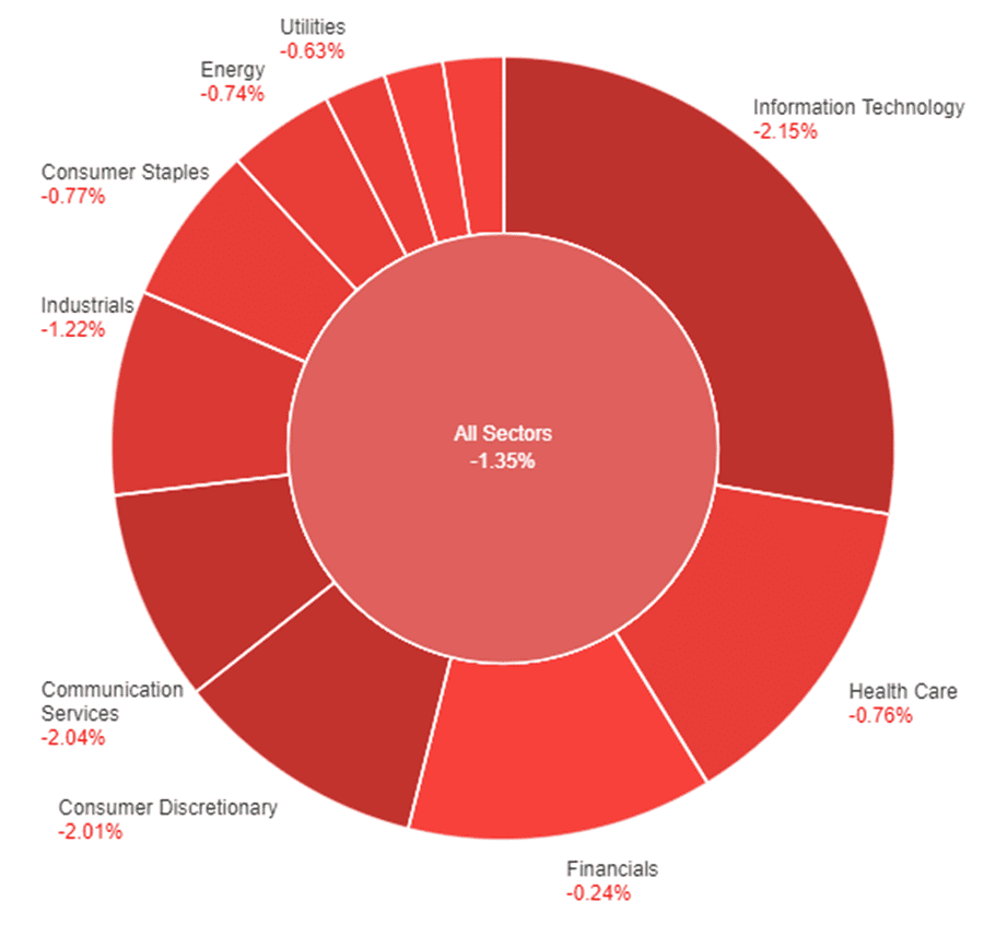 On Thursday, all sectors of the stock market experienced a decline of 1.35%. Among the various sectors, technology and communication services were hit the hardest, both dropping by 2.15% and 2.04% respectively. Consumer discretionary also faced a substantial decrease of 2.01%. Industrials followed with a decline of 1.22%. Health care, energy, and utilities sectors recorded losses of 0.76%, 0.74%, and 0.63% respectively. Financials, real estate, and materials sectors had more modest declines, each decreasing by 0.24%, 0.41%, and 0.43%. The consumer staples sector also saw a decrease of 0.77% in its value.