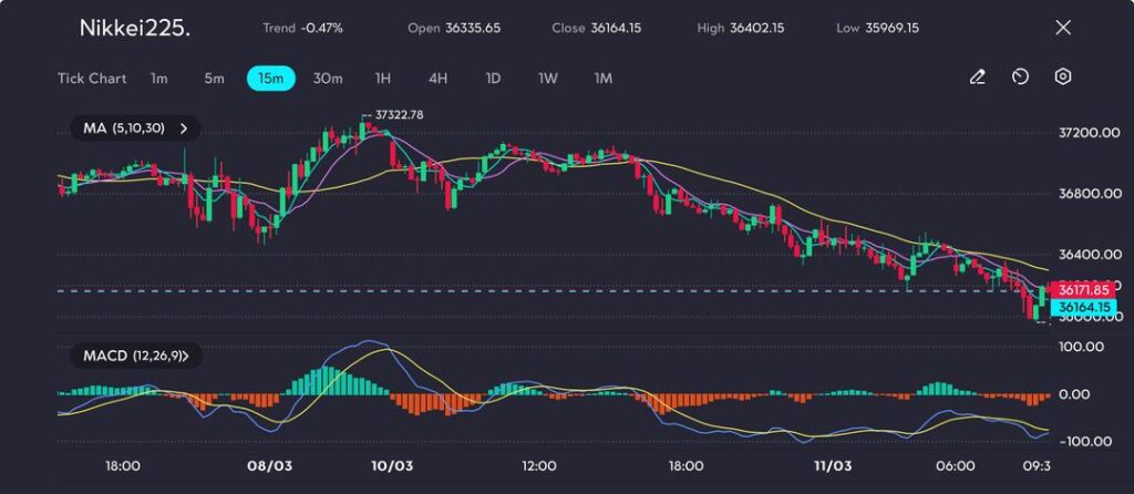 The Nikkei 225 is down 0.47%, reflecting ongoing selling pressure. The index opened at 36,335.65 and closed at 36,164.15, with a high of 36,402.15 and a low of 35,969.15. The moving averages (5, 10, 30) are sloping downward, confirming the bearish trend, while the MACD remains in negative territory, signaling continued downside momentum.