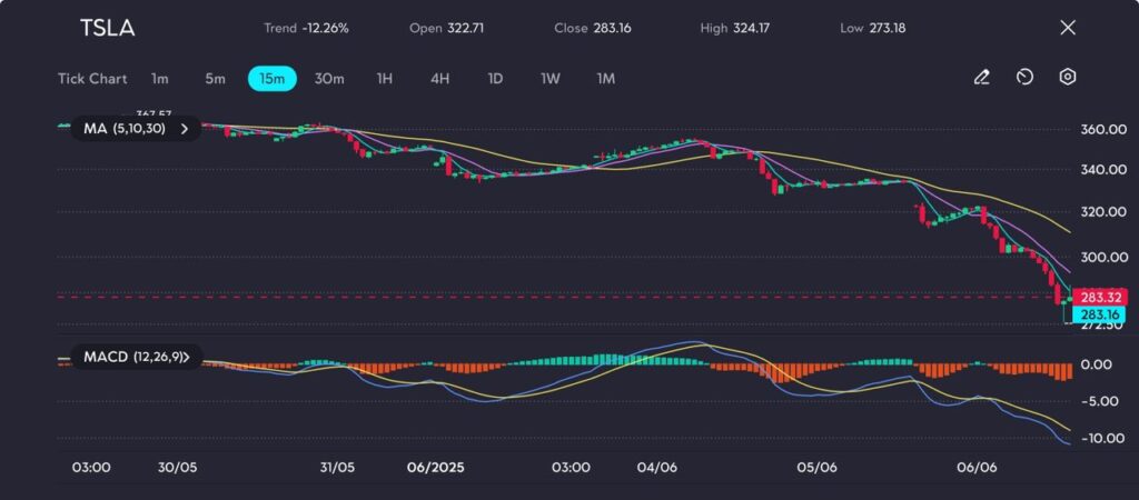 Tesla (TSLA) has experienced a sharp decline in recent sessions, dropping over 12% from highs near $324 to lows around $273 before settling near $283. The 15-minute chart reveals strong bearish momentum, as indicated by all three moving averages (MA 5, 10, 30) sloping decisively downward with significant separation between them. This alignment signals sustained selling pressure and a lack of near-term recovery strength.