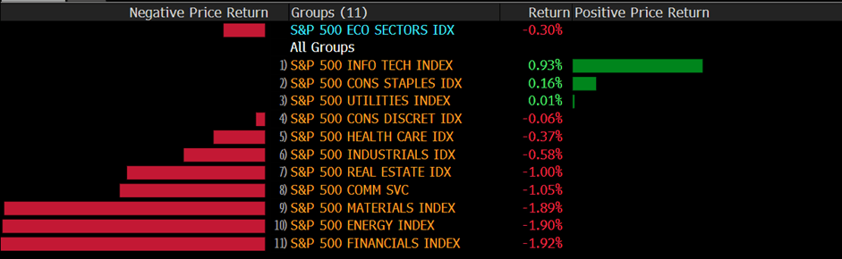 The benchmarks, S&P 500 and Nasdaq 100 both dropped on Thursday as the equity market stayed under pressure amid high inflation and fears of a global recession. The S&P 500 was down 0.3% daily and the Nasdaq 100 also declined with a 0.3% loss for the day. Eight out of eleven sectors stayed in negative territory as the financials and the energy sectors are the worst performings among all groups, losing 1.92% and 1.90%, respectively. The Dow Jones Industrial Average meanwhile declined the most with a 0.5% loss on Thursday and the MSCI World index fell 0.8%.