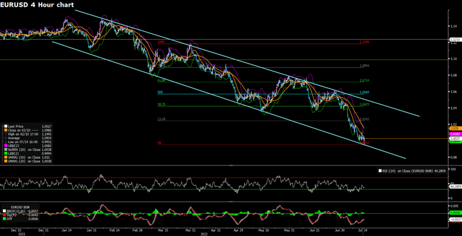 US stock continued to stay in negative territory but closed above session lows as Federal Reserve officials’ comments have eased investors’ concerns about a recession caused by the aggressive pace of monetary tightening. Federal Reserve Governor Christopher Waller said that markets may have gotten ahead of themselves by pricing a 100 basis points rate hike in July, adding that they would back a 75 bps rate hike after a hot inflation report. Therefore, traders shifted their bets away from a 100 bps rate hike by the Fed this month, but people are now confused that where the economy is heading and whether we are going into recession. In the Eurozone, the Russian energy giant Gazprom said that it would not guarantee to resume the functioning of the Nord Stream 1 pipeline after it was shut down for repairs. The uncertainty around gas deliveries is weighing on Europe’s economic outlook.