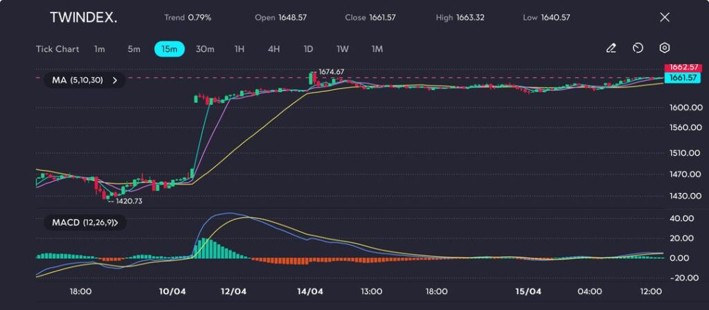 The TWIndex continues to trade in a tight consolidation zone following a powerful breakout from 1420.73 to 1674.67, a move that unfolded between April 10 and 12. Since printing the local high, the price has flatlined just under resistance at 1675, with recent candles showing minimal volatility and low volume, suggesting a classic case of post-rally exhaustion or accumulation.