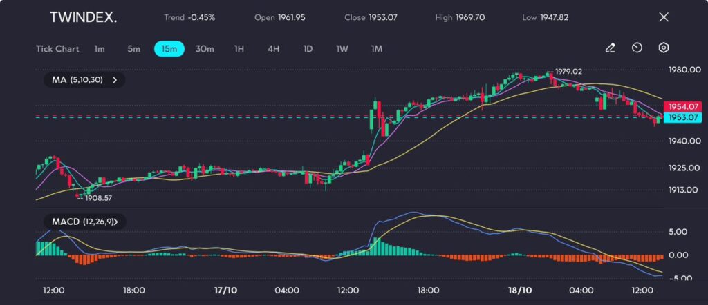 Picture: TWINDEX falls to 1953.07, with bearish momentum building, as seen on the VT Markets app.