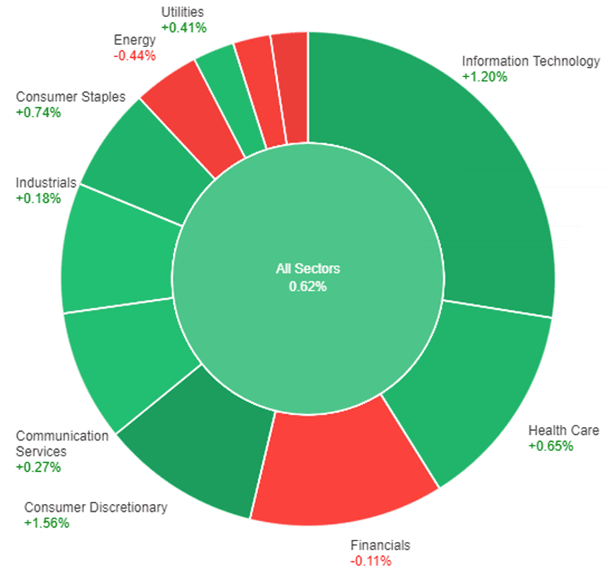 On Thursday, most sectors of the market experienced a positive performance. Consumer Discretionary showed the strongest gain, rising by 1.56%. Information Technology also had a notable increase of 1.20%. Consumer Staples and Health Care sectors followed with gains of 0.74% and 0.65%, respectively. Utilities and Communication Services sectors showed modest gains of 0.41% and 0.27%, while Industrials had a slight increase of 0.18%.