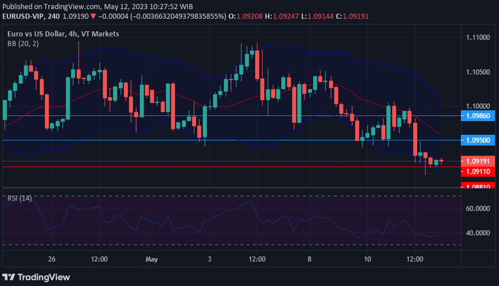 According to technical analysis, the EUR/USD pair is currently trending lower after reached the lower band of the Bollinger band. It is expected that the EUR/USD will continue to move lower and push the lower band. The Relative Strength Index (RSI) is presently at 37, suggesting a lower trend in the EUR/USD market.
