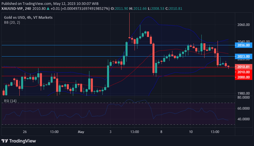 Gold (XAU/USD)prices experienced a sharp decline on Thursday, hitting a new weekly low of $2,011.09, due to a surge in the US dollar amid a persistent dismal mood, resulting in a sell-off in the stock markets. The mood was impacted by banking issues, as the FDIC proposed extra fees for large banks to cover the $16 billion lost on the rescue of Silicon Valley Bank and Signature Bank in March. Furthermore, concerns around the US debt ceiling continued to undermine the sentiment, as Republican lawmakers are reluctant to back President Joe Biden’s plan. Additionally, government bond yields remain depressed, with the 10-year Treasury note yields at 3.38%, down 5 basis points, and the 2-year note offers at 3.86%, shedding 3 bps, due to the easing of inflation-related figures in April, as the PPI increased by 2.3% YoY.