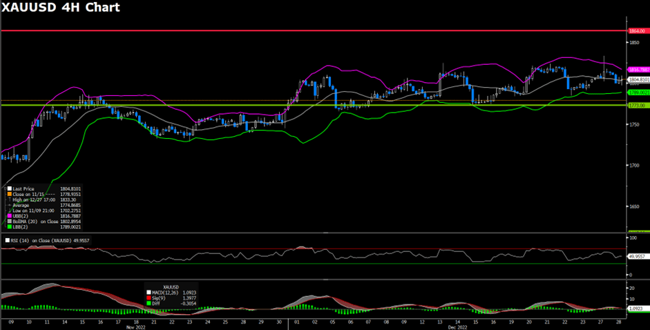 XAUUSD gave back gains after surging higher on Tuesday and fell further on Wednesday, basically having spit out all gains so far. The prices edged lower by nearly 1% to the lowest price at $1,797 during the American trading session. It is hovering around $1,800 with bearish trends. As the price broke through the last estimated support of $1,812 and $1,800, it would make gold vulnerable to a decline to test an uptrend line around $1,795. A break below could trigger more losses, to the $1,785 zone. Below the next support is located at $1,773, which is Dec 15 & 16 low. As equity prices in Wall Street turned negative and amid a rebound in US yields to fresh daily highs, and the US Dollar Index rose from the lowest level in almost a week at 103.84 to 104.45, the strongest since Friday. The context put pressure on the gold price.