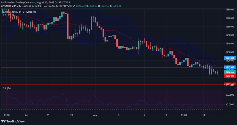 Based on technical analysis, the XAU/USD witnessed a slight decrease on Monday, the price managed to reach the lower band of the Bollinger Bands during this movement. At present, the price is retracing higher. The Relative Strength Index (RSI) is currently at 37, indicating that the XAU/USD pair is exhibiting a somewhat bearish sentiment.