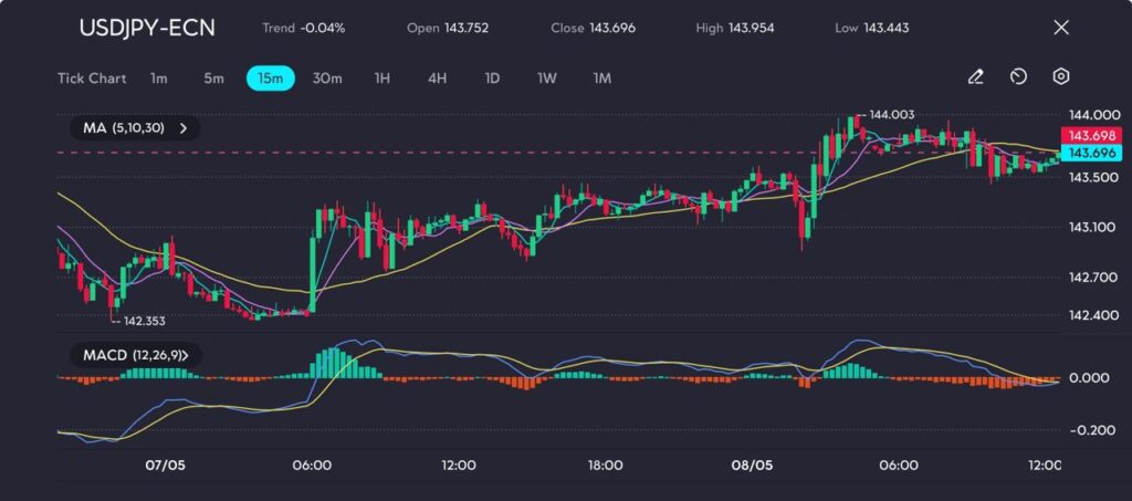 Picture: USDJPY rebounds from 142.35 and taps 144.00, but momentum cools as price stalls beneath resistance, as seen on the VT Markets app