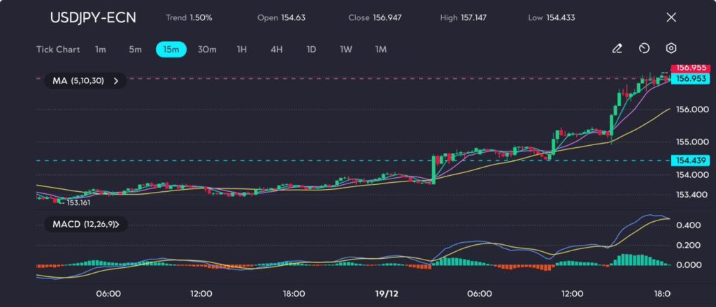 Picture: USDJPY surging higher, exceeding 156.95 as bullish momentum intensifies, as seen on the VT Markets app.