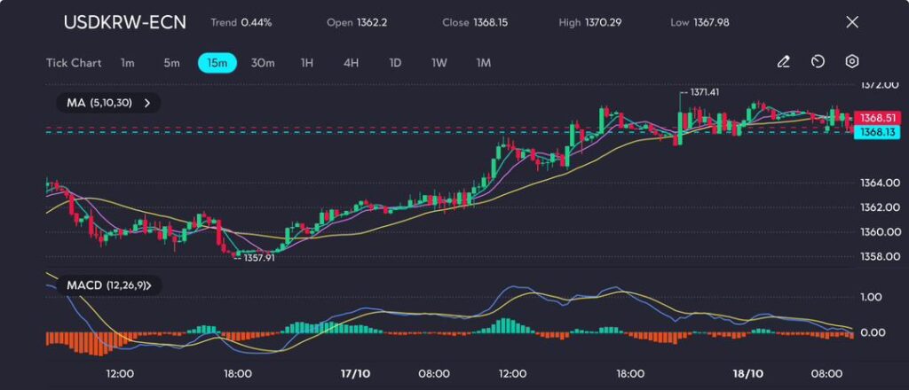Picture: USD/KRW climbs to 1368.15, with bullish momentum slowing as traders watch for resistance near 1371.41 as seen on the VT Markets app.