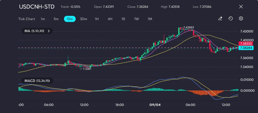 The offshore yuan (USDCNH) hit a new low on 09 April at 7.4288 per dollar, as escalating trade tensions between the U.S. and China intensified market uncertainty. Following the drop, the offshore yuan bounced slightly, recovering by 0.62% to 7.38333 in the Asian session.