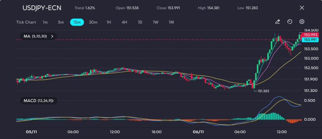 Picture: USD/JPY shows a strong bullish momentum with recent gains pushing toward 154.381, supported by aligned moving averages and a positive MACD, as seen on the VT Markets app.