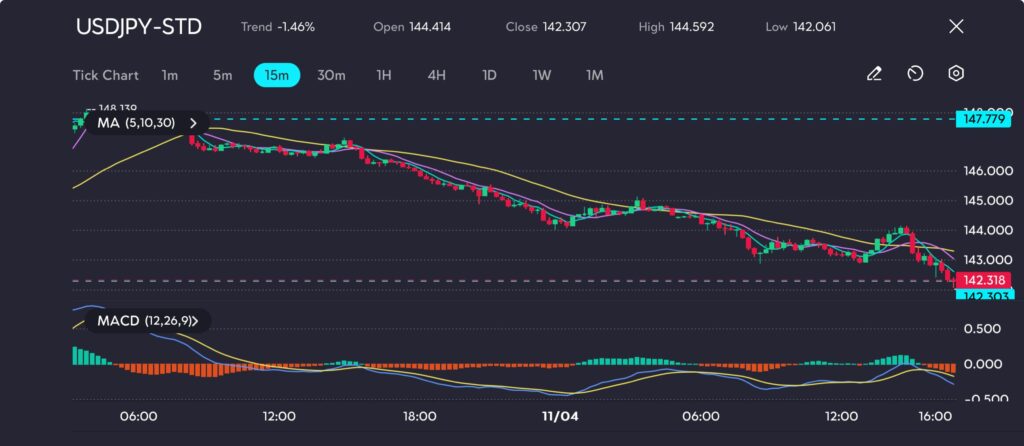 The U.S. dollar faced further pressure as Treasury yields dropped, reinforcing the yen’s rise. U.S. Treasury selloffs, typically considered a hedge against economic uncertainty, have led to increased demand for the Japanese yen, further pushing USDJPY lower.