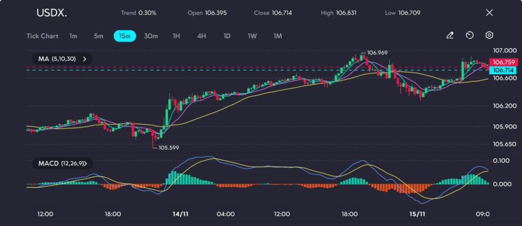 The Dollar Index (USDX) has maintained its upward trajectory, recording a recent high of 106.969, as shown in the 15-minute tick chart. The steady climb reflects a shift in market sentiment, driven by both economic expectations and political factors.