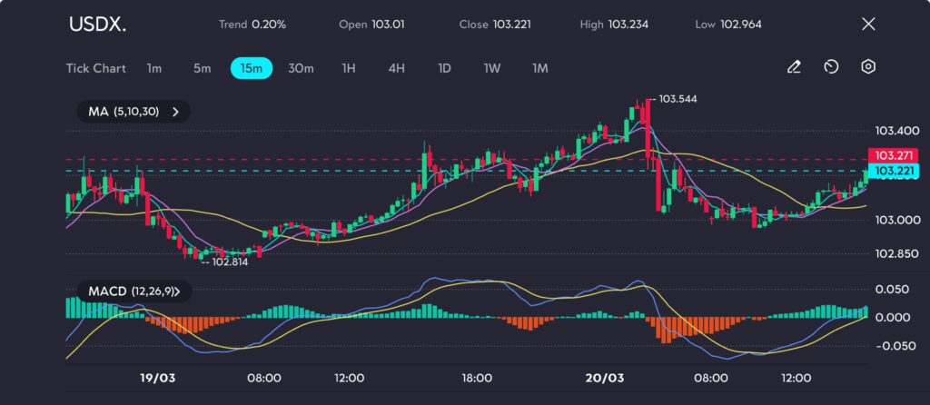 The USDX (US Dollar Index) remained muted following Jay Powell’s comments at the Federal Reserve’s meeting. Trading around 103.22, the USDX showed little reaction to the Fed’s decision to keep rates steady.