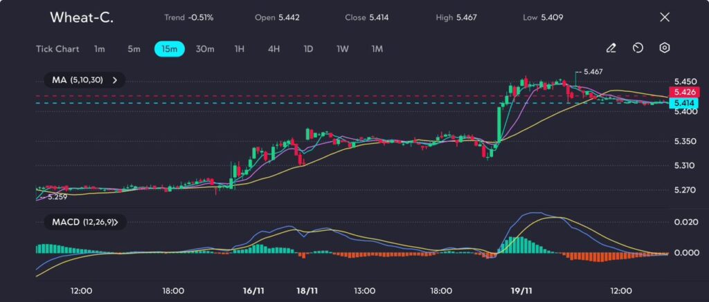Picture: Wheat prices hold steady near $5.42 after recent gains, with momentum slowing at resistance levels, as seen on the VT Markets app.