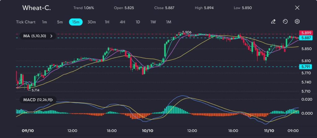 Picture: Wheat futures climb to 5.887, supported by bullish momentum and positive signals from moving averages and MACD, as seen on the VT Markets app.