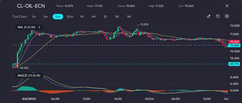 This 15-minute chart of Crude Oil (CL-OIL-ECN) shows a strong initial rally, with price surging from 69.55 to a high of 72.08, followed by a gradual but steady decline and consolidation phase. The MACD peaked early and has since turned bearish, reflecting declining momentum. The price is now trading around 70.84, beneath the moving averages (5, 10, 30), suggesting short-term pressure from sellers.