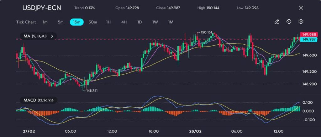 The USD/JPY pair is showing a mild uptrend of 0.13%, with the price opening at 149.798 and closing at 149.987. The pair tested a high of 150.161 before pulling back slightly, while the low was recorded at 149.098. The moving averages (5, 10, 30) are sloping upward, suggesting continued bullish momentum, and the price is currently attempting to break above resistance at 150.16. The MACD shows increasing buying pressure, with the MACD line crossing above the signal line and a growing positive histogram.