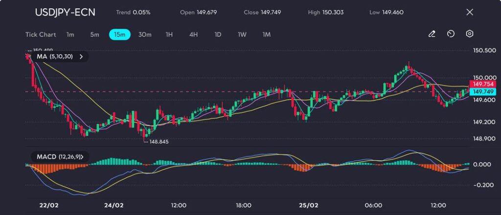 USD/JPY has seen choppy price action around 149.70, with a recent high near 150.30 and a swing low around 148.85. The short-term moving averages (5, 10, 30) show mixed signals, with the price dipping below them briefly before regaining ground, indicating no clear directional bias.