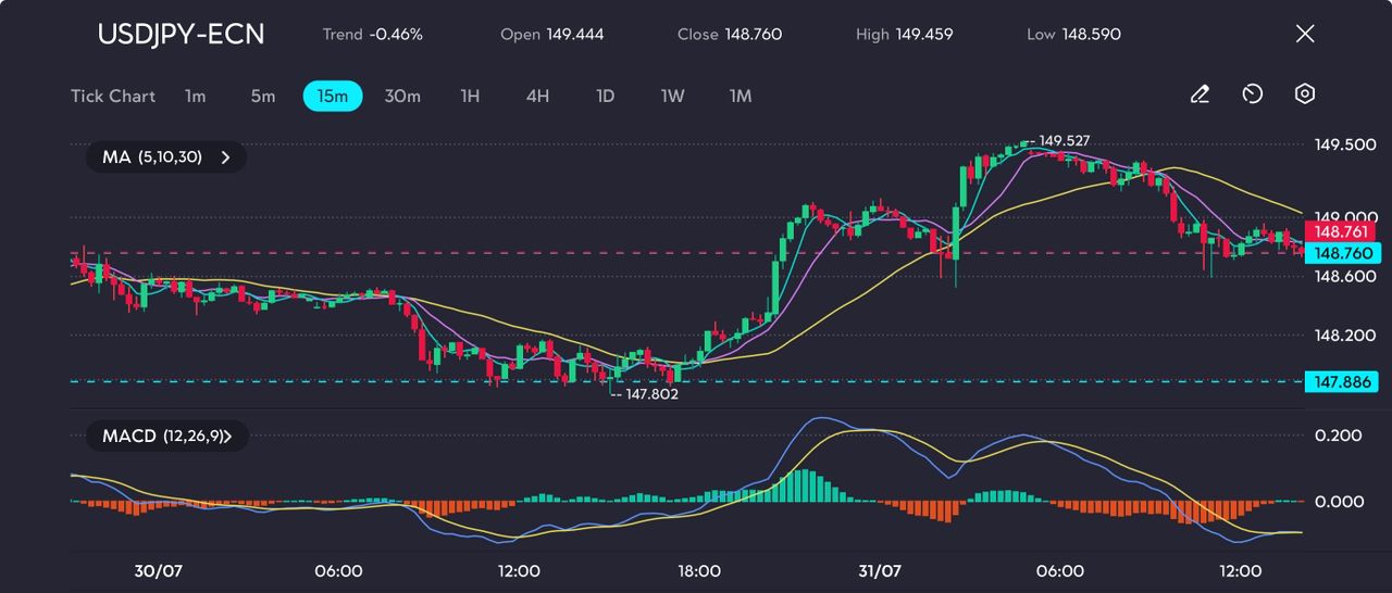 The pair found intraday support around the 147.80 level on 30 July before rebounding strongly through the Asian and European sessions. A clear bullish leg lifted USDJPY to an intraday high of 149.527, forming a near-perfect double-top pattern as price failed to sustain above that resistance zone. This failure sparked a pullback to the 148.60–148.70 region by 31 July.