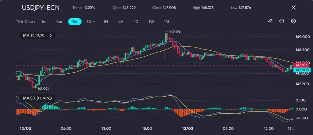 The USD/JPY pair is trading at 147.91, reflecting a -0.22% decline for the session. After peaking at 149.19, the price reversed, experiencing a steady downtrend. The moving averages (5, 10, 30) confirm the bearish sentiment, with the price trending below key levels. The MACD is in negative territory, indicating downward momentum, though a slight pickup in histogram bars suggests a potential near-term bounce.