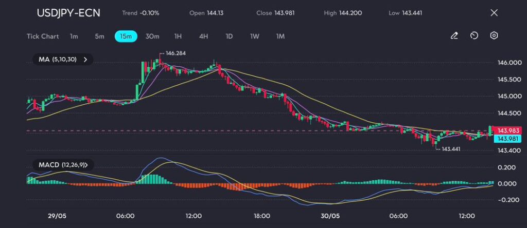 USDJPY spiked to a session high of 146.284 early on 29 May before facing steady downward pressure through the rest of the day and into 30 May. The pair has since been caught in a sustained downtrend, with price action consistently below the 30-period moving average, confirming bearish dominance. Attempts at intraday recoveries have so far been capped by the 10- and 30-MA crossovers, reinforcing the prevailing resistance.