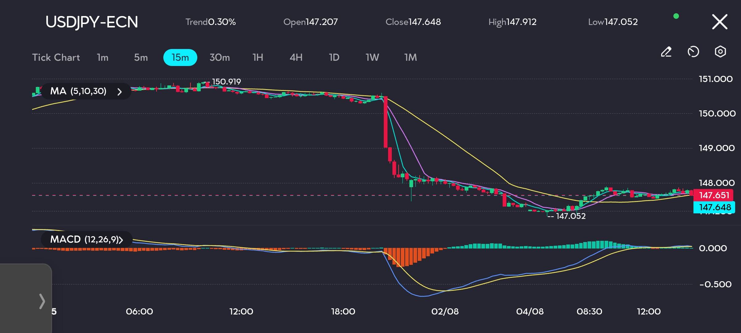 The price action now shows a market pausing to digest the move. The moving averages (MAs) on the chart are tightly coiled around the current price. When MAs flatten and move sideways with the price, it typically signals trader indecision and a lack of a clear short-term trend. The price is using the slower 30-period MA as a dynamic level of support.