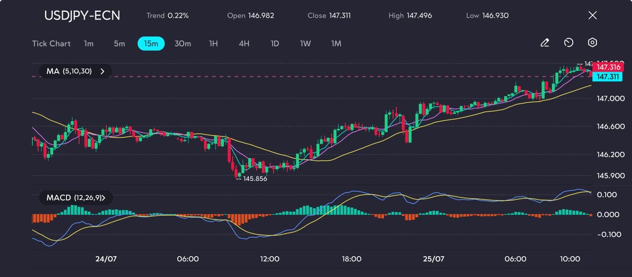 The 15-minute chart for USD/JPY shows a clean bullish structure. Price opened at 146.982 and closed at 147.311, breaking upward through multiple resistance levels.