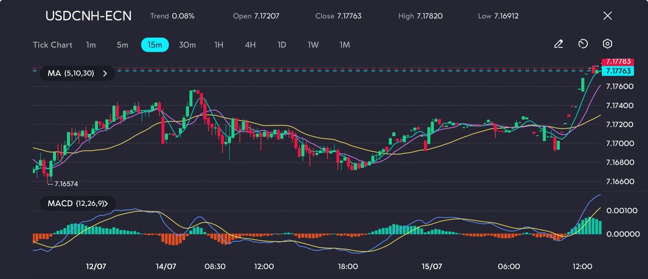 China’s yuan slipped slightly against the dollar on Tuesday despite a stronger-than-expected GDP report, with USD/CNH rising as high as 7.1782 before settling near 7.1776. The modest move upward reflects the market’s cautious stance following a mixed slate of economic data and persistent pressure for Beijing to enact further stimulus.