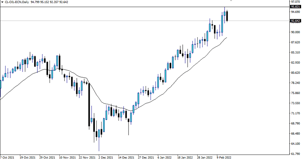 The drama surrounding the buildup of soldiers on the Russian-Ukrainian border has prompted market participants to seek a safe-haven, put pressure on the stock market due to the high-risk element, and pushed world oil prices back up to $95/barrel.