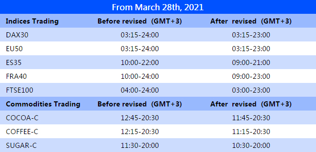 Due to the UK/EU Daylight Saving, the adjusted trading hours (of certain products), which will be excuted on 28th March, are shown as below.