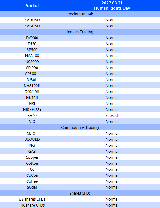 The above time is MT4/5 server time. The trading time of other products is not affected. The above data may be subject to change. Please refer to the actual time on MT4/5.