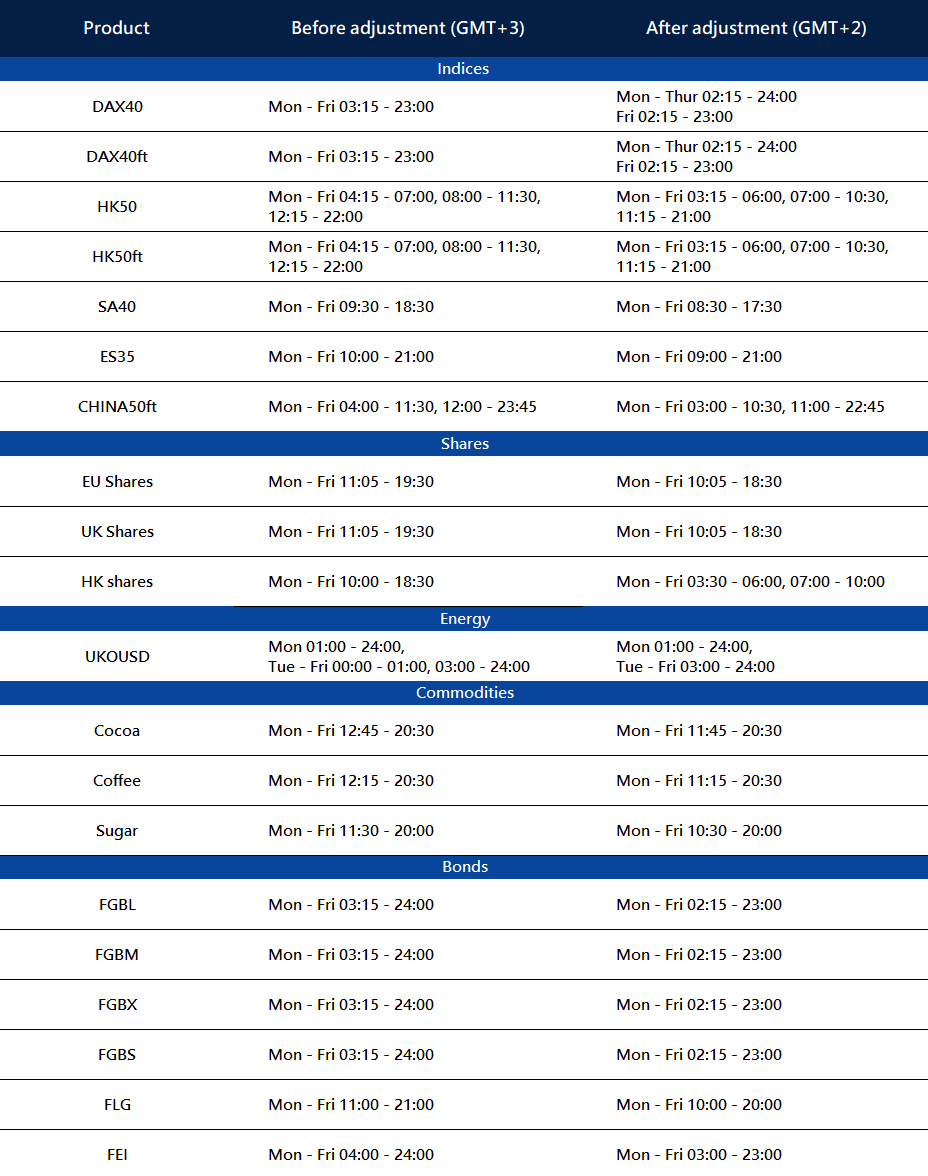 Dear Client, The trading hours of some MT4/MT5 products will change due to the upcoming Daylight-Saving Time change in US. …