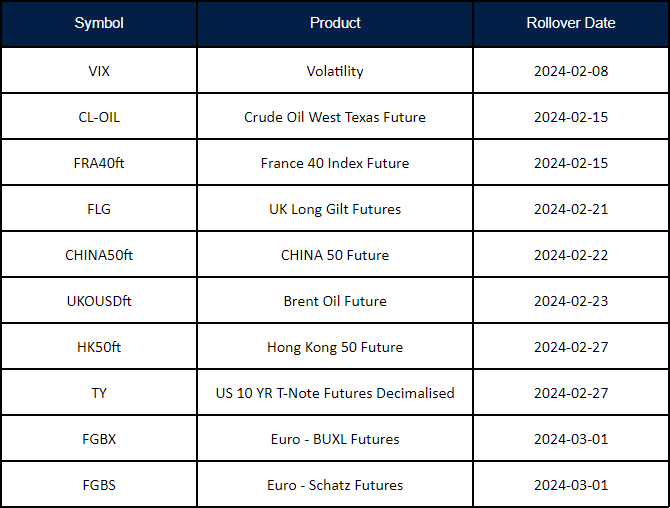 • Positions that are open on the expiration date will be adjusted via a rollover charge or credit to reflect the price difference between the expiring and new contracts.