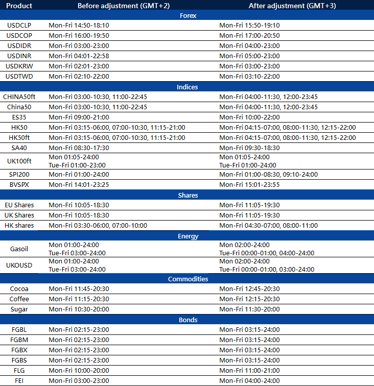 The trading sessions of some products on MT4/MT5 will be changed as follows.