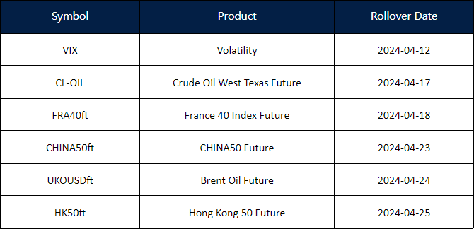 • Positions that are open on the expiration date will be adjusted via a rollover charge or credit to reflect the price difference between the expiring and new contracts.