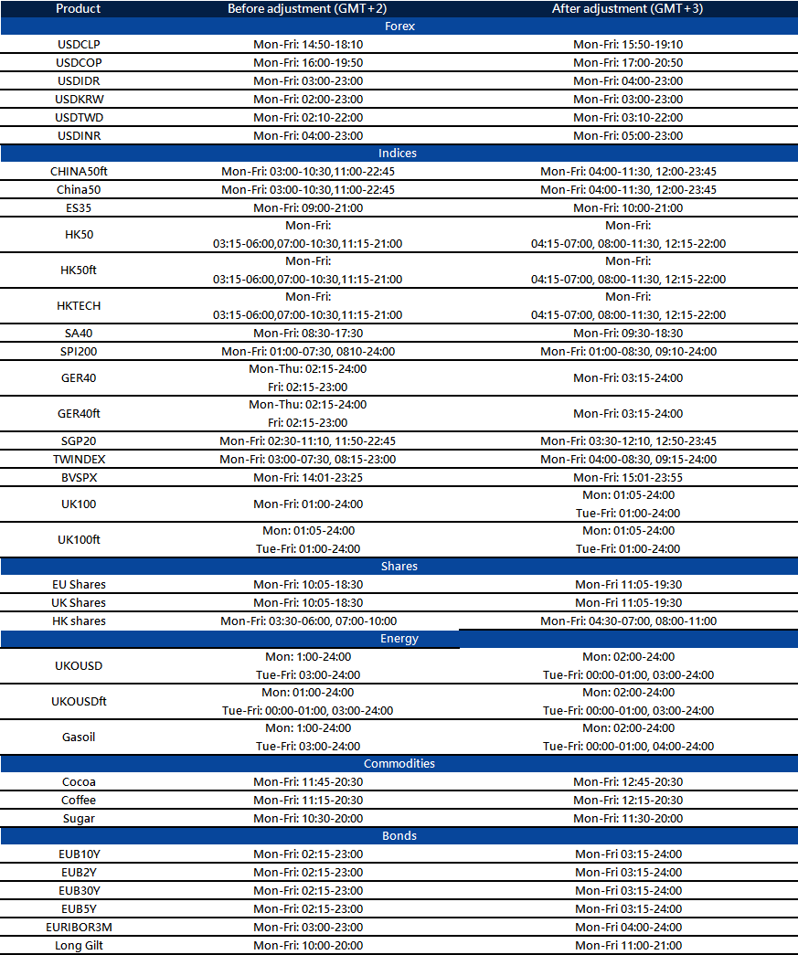 Dear Client, The trading hours of some MT4/MT5 products will change due to the upcoming Daylight-Saving Time change in EU/UK. …