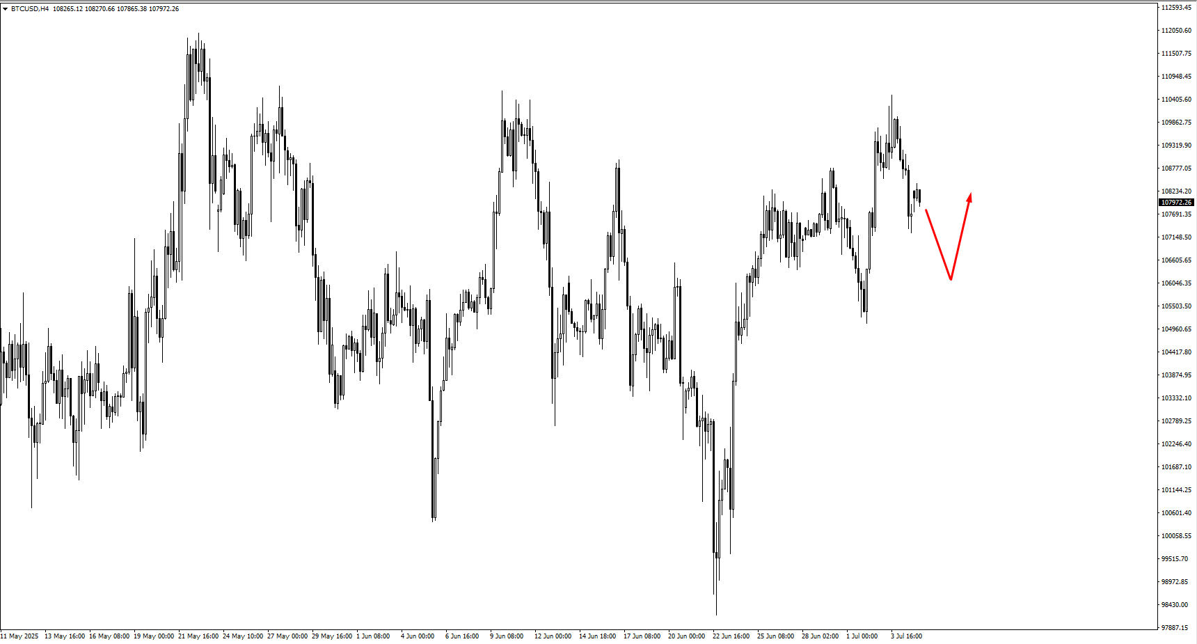 Bitcoin dropped hard from the 109,650 monitored level. It’s still bleeding. The next support is at 105,700, where traders expect a bullish reaction—at least temporarily. Crypto markets are jittery, and sentiment could turn quickly, especially if macro risks mount.